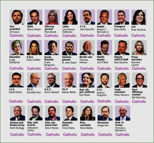 During the Obama administration, roughly half of the members of his cabinet were Catholic, including Vice President Joe Biden, along with six of the nine Supreme Court justices and all senior military and security officials. These proportions are broadly similar to those in the current Trump administration, where 52.5% of cabinet members are Catholic, not including White House Press Secretary Karoline Leavitt.